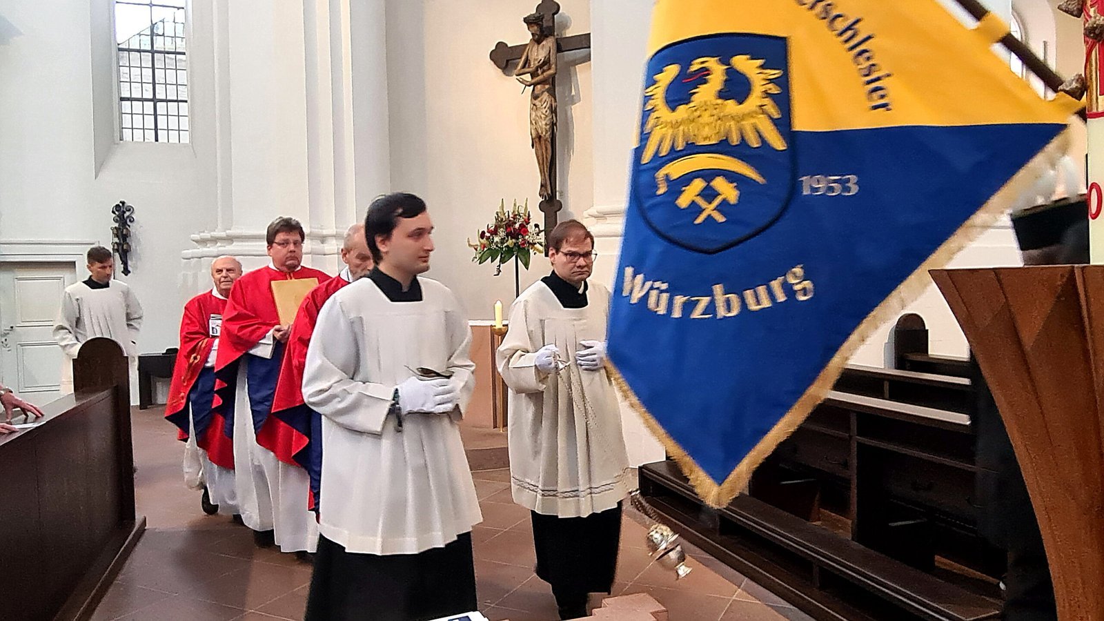 Die Messe wurde von Pfarrer i.R. Adam Possmayer zelebriert und war ein besonderes Ereignis für die Aussiedler und Vertriebenen, die sich in Würzburg und Umgebung niedergelassen haben. Die verschiedenen Landsmannschaften, darunter die Landsmannschaft der Oberschlesier e.V. – Kreisgruppe Würzburg, waren dankbar für die Möglichkeit, gemeinsam Gottesdienst zu feiern und sich in Gemeinschaft zu erleben. Es war ein bewegendes und ermutigendes Ereignis, das die Verbundenheit und Solidarität unter den Aussiedlern und Vertriebenen stärkte und ein wichtiger Schritt, um die Geschichte und die Erfahrungen der Aussiedler und Vertriebenen in der Diözese Würzburg lebendig zu halten und zu würdigen. Nach der Messe trafen sich die Gläubigen auf dem Kiliansplatz, um sich auszutauschen und gemeinsam zu feiern.